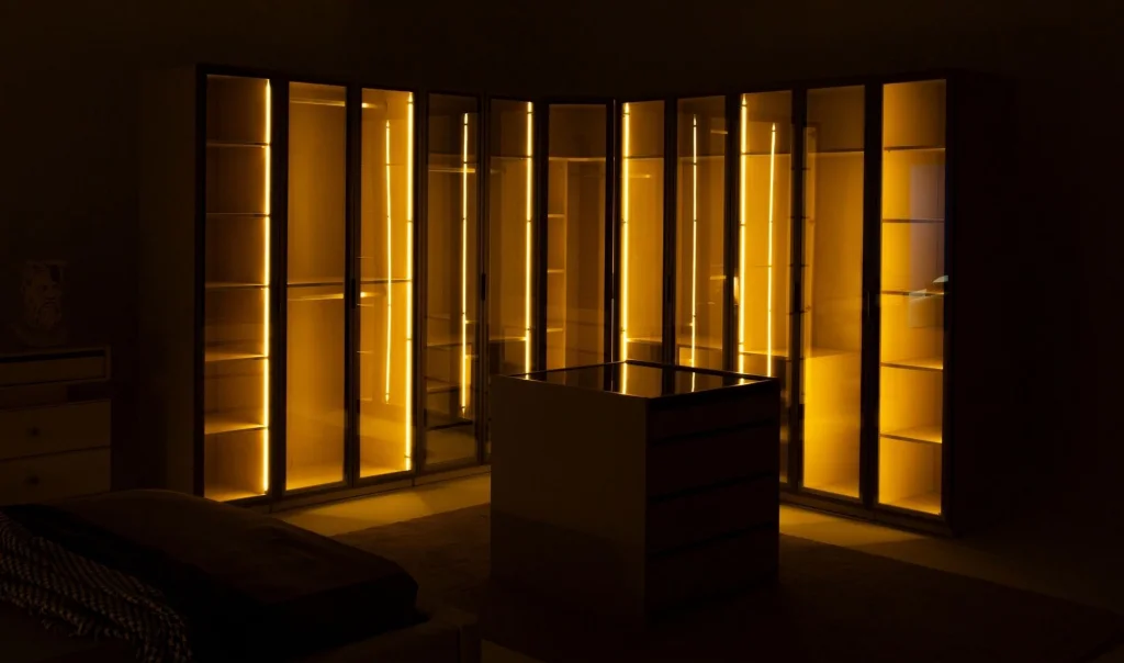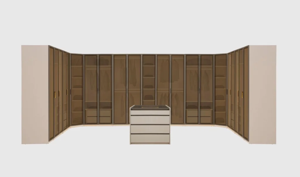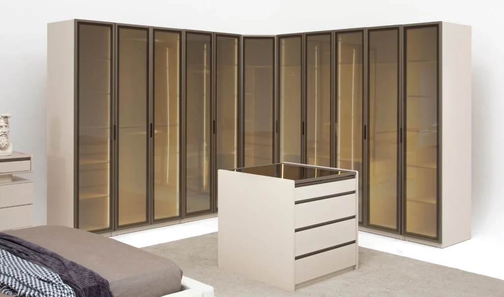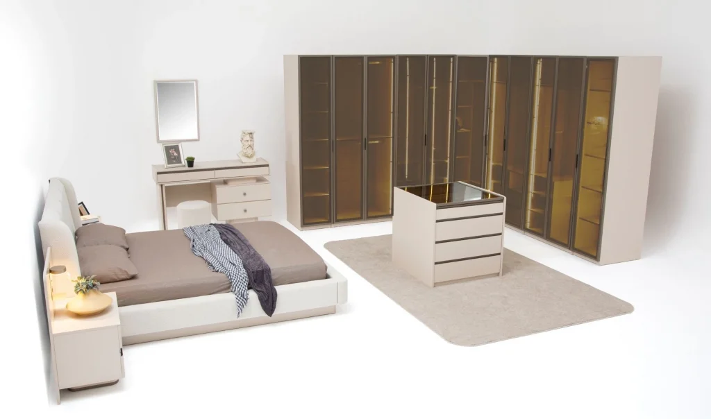 • 2 ad. Tekli camlı dolap - 4 ad. 2'li Camlı dolap ve 1 ad. Köşe dolap, giyinme dolabı fiyatına dahildir.