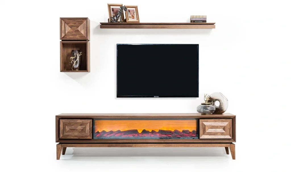 Takım İçeriği1 ad. Tv ünitesi şömineli alt modül + 1 ad. Tv ünitesi üst blok + 1 ad. Tv ünitesi üst raf