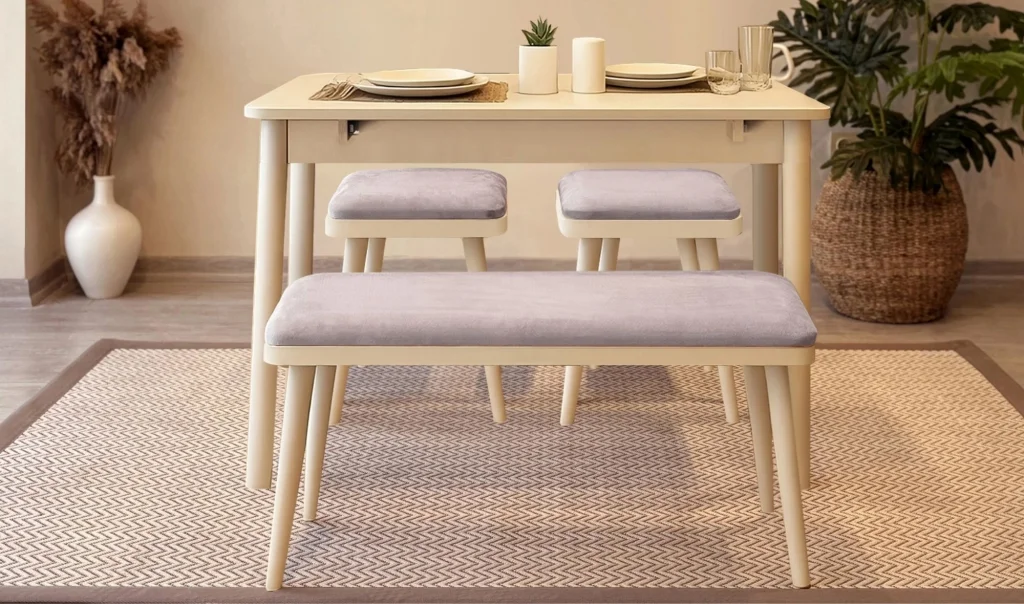 1 ad. Mutfak masası (Açılır) + 2 ad. Tabure + 1 ad. Benç