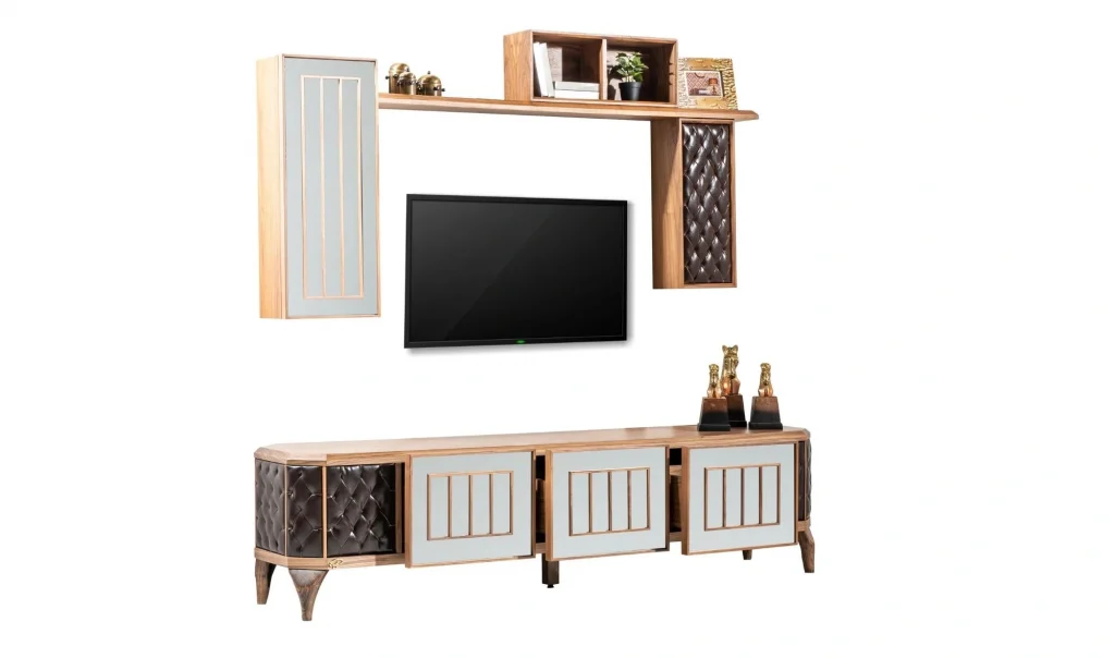 Takım İçeriği1 ad. Tv ünitesi alt modül (3 çekmeceli) + 1 ad. Tv ünitesi döşemeli modül + 1 ad. Tv ünitesi düz raf + 1 ad. Tv ünitesi aynalı modül + 1 ad. Tv ünitesi kutu raf